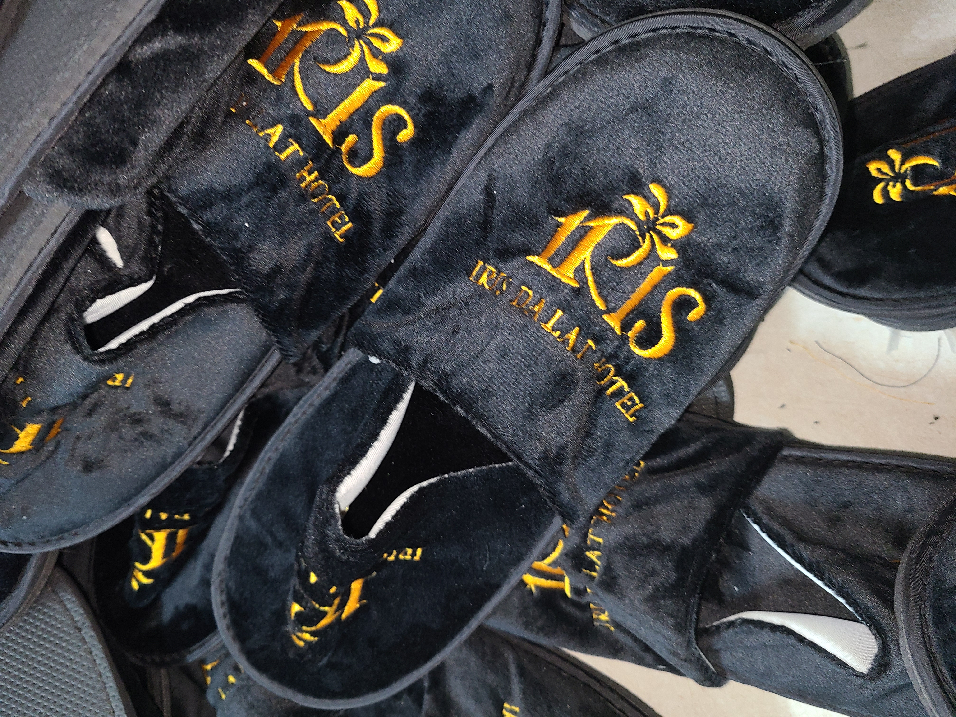 Dép vải lông đen thêu logo , chất liệu êm ái ,thích hợp đi trong nhà, chuyên dùng cho spa , resort khách Sạn cao cấp.